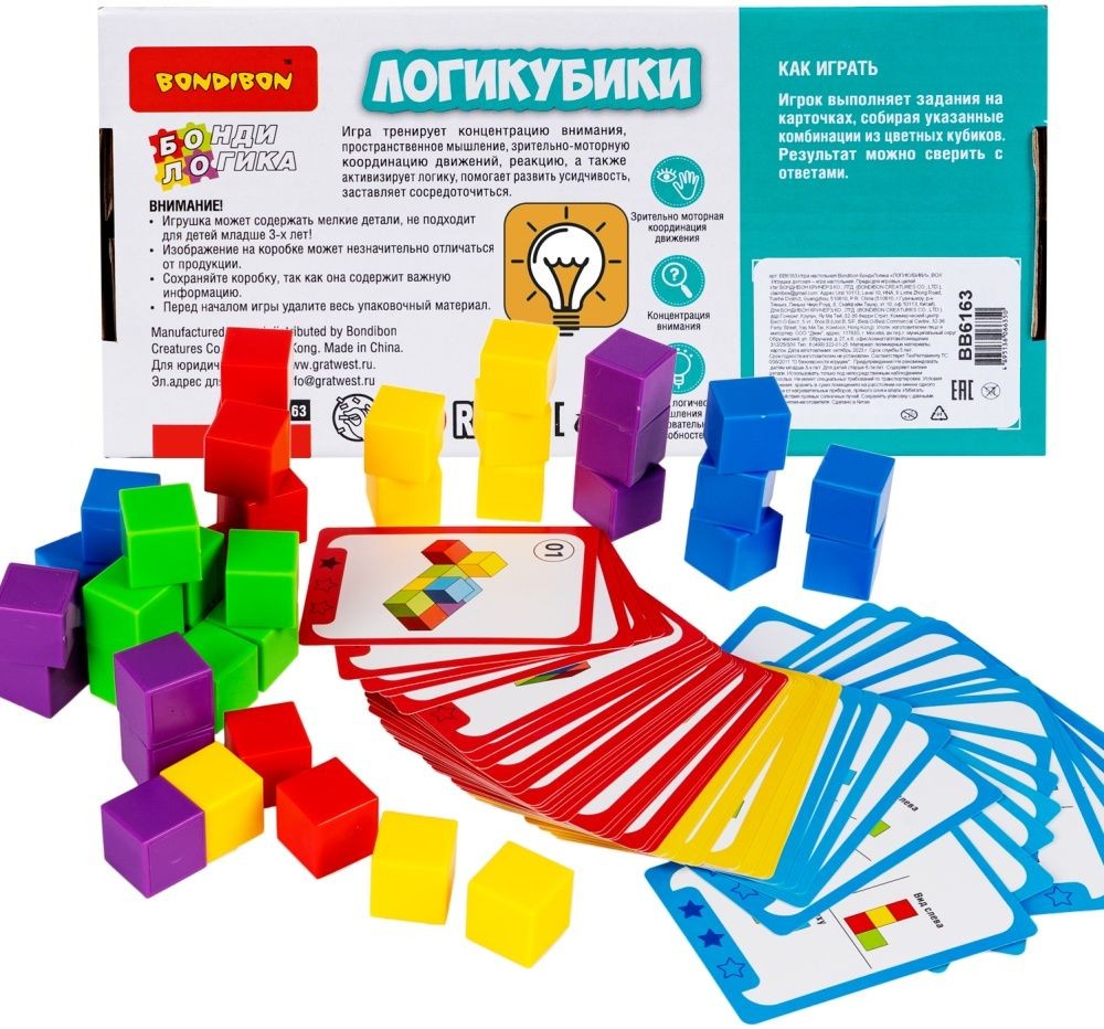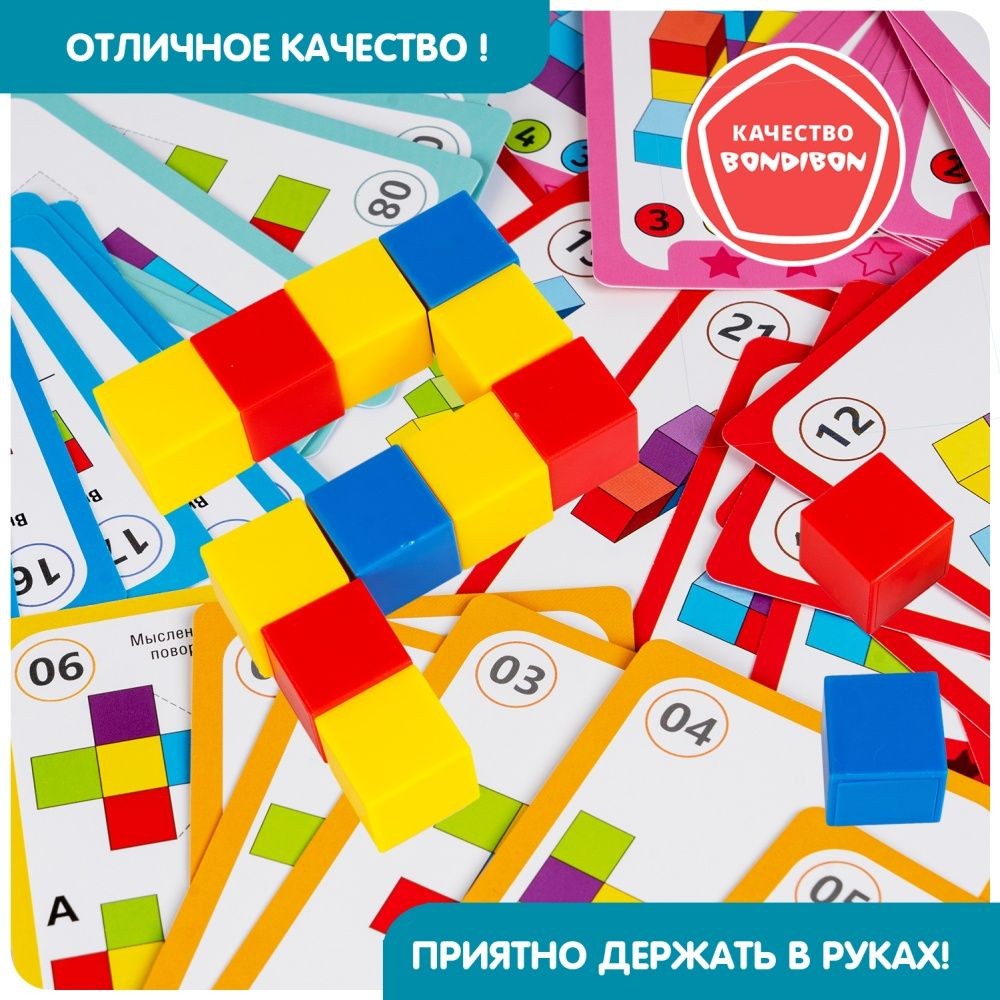 Яркая головоломка со множеством заданий разных уровней сложности и деталями в виде разноцветных кубиков! Настольная логическая игра ЛОГИКУБИКИ серии БондиЛогика от Bondibon придется по вкусу дошкольникам и младшим школьникам. Выберите карточку с заданием попроще или посложнее, ориентируясь на возраст игрока. Выполняйте задание, собирая изображенную комбинацию из цветных кубиков. Результат можно сверить с ответами. Увлекательная головоломка способствует изучению основных цветов, развитию интереса к конструированию, моделированию, тренирует концентрацию внимания, координацию движений, усидчивость, пространственное и логическое мышления. Игра ЛОГИКУБИКИ серии БондиЛогика от Бондибон станет интересным подарком для ребенка на день рождения, Новый год и любой другой праздник. Головоломка выполнена из качественных безопасных материалов. В набор входят: 54 карточки, 40 кубиков, ответы. В каждом из 6 видов заданий 3 уровня сложности. Возраст 6+ Количество игроков 1