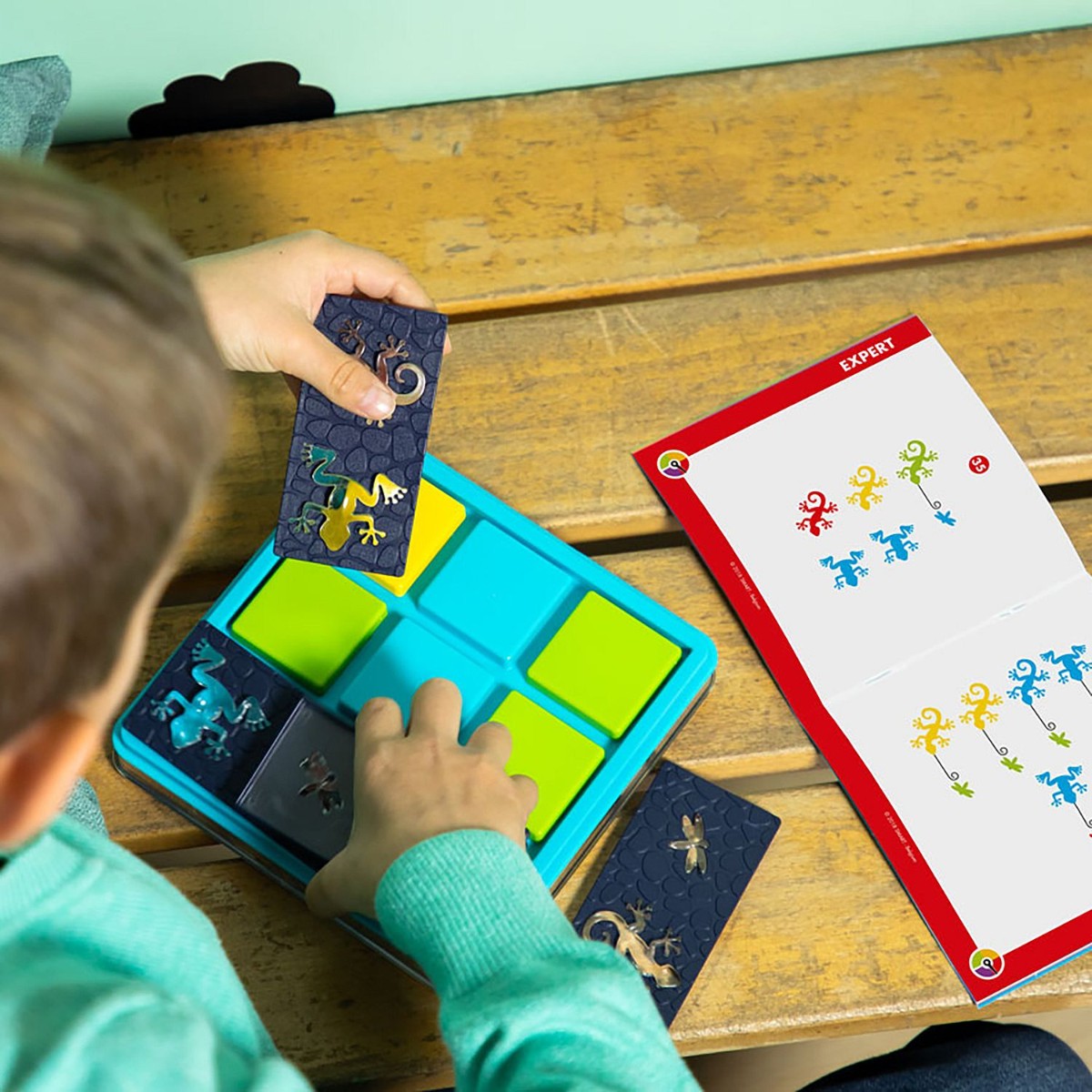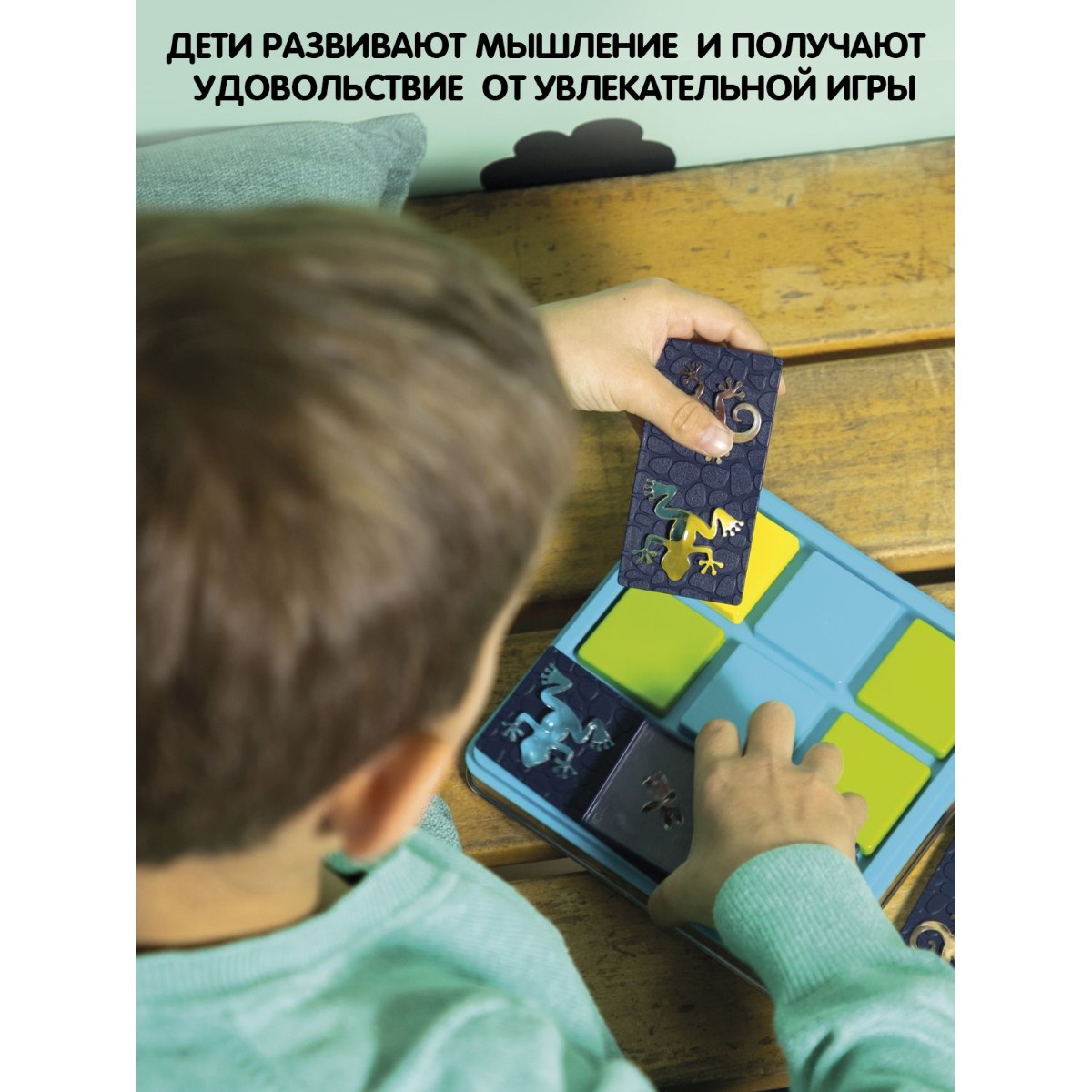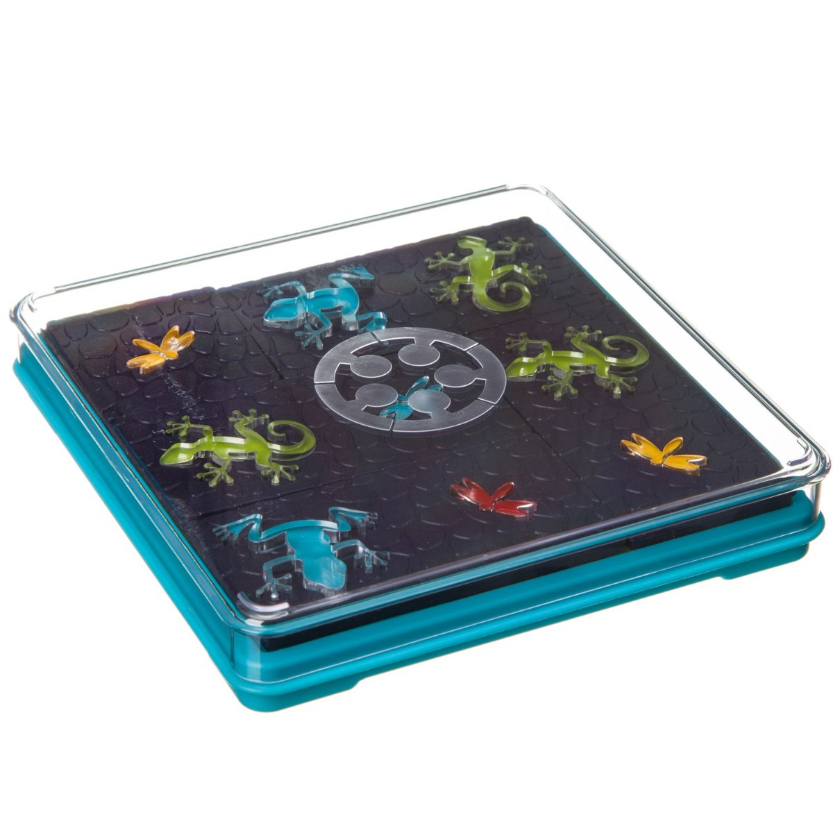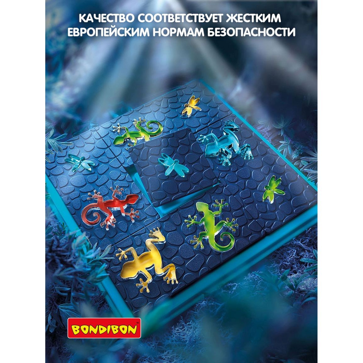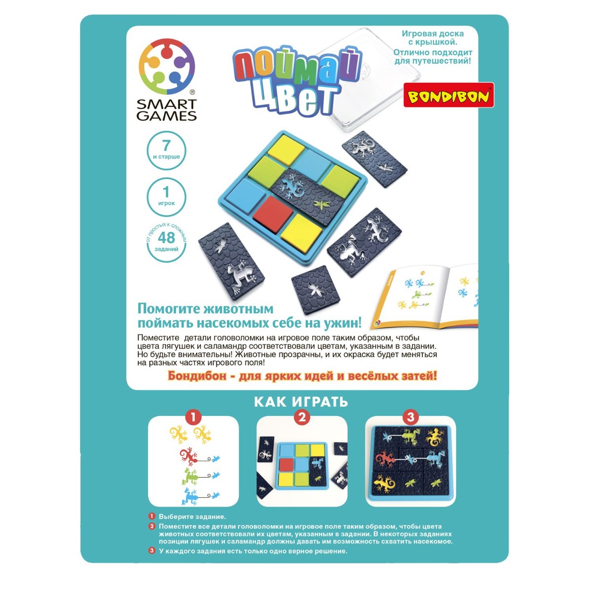 Помогите животным поймать себе жука на ужин! Поместите детали головоломки на игровое поле, таким образом, чтобы цвета лягушек и саламандр соответствовали указанным в задании. Но будь внимательны! Животные прозрачны, и их цвета будут меняться на разных участках игрового поля! Игра содержит: игровую доску с цветными квадратами и прозрачной крышкой, 5 деталей головоломки с прозрачными лягушками, саламандрами и жуками, буклет с 60 заданиями и их решениями. Правила игры: 1. Выберите задание. 2. Поместите все детали головоломки на игровое поле таким образом, чтобы цвета животных соответствовали их цветам, указанным в задании. В некоторых заданиях позиции лягушек и саламандр должны давать иметь возможность схватить насекомое. 3. У каждого задания есть только одно верное решение.