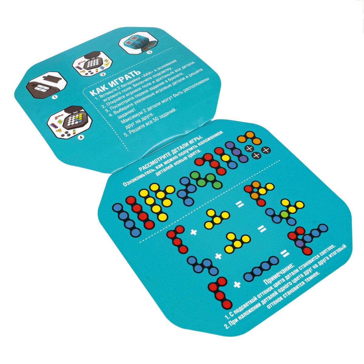 Выберите одно из 50 заданий и сложите полупрозрачные детали, чтобы решить его. Только одна комбинация решает задание правильно!
