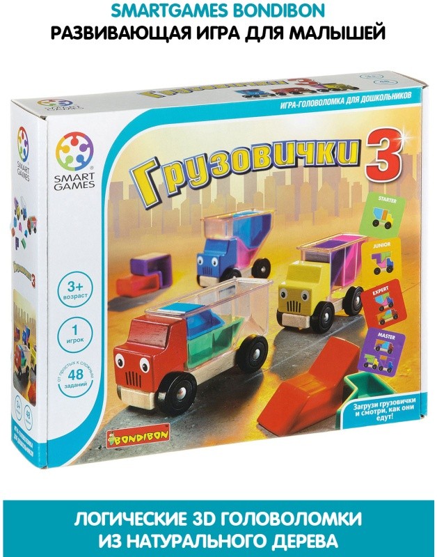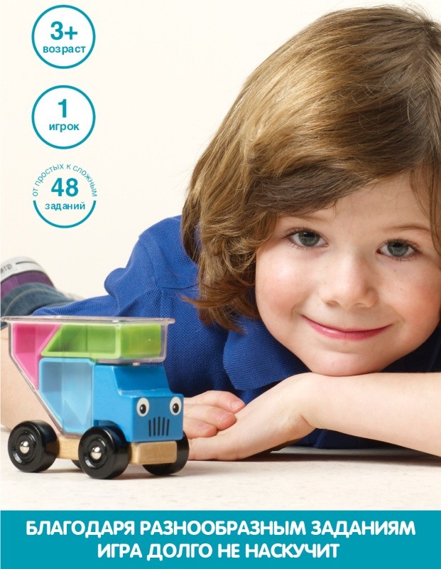 Самый первый в жизни собственный грузовой автопарк. Колонна глазастых грузовичков отправляется в дальнее путешествие. Но как загрузить в прозрачный кузов все эти разноцветные детали причудливых форм, чтобы не осталось пустого места? Вот это задачка для юного автомобилиста! Малыши смогут просто играть с грузовичками, складывая и выкладывая детали-формочки, а дети постарше научатся выполнять задания этой головоломки, компактно заполняя кузова грузовичков. И очень может быть, что выполняя увлекательные задания по карточкам, Ваши юные "грузоперевозчики", даже не догадаются, что не просто играли, но решали сложные инженерные и логистические задачи. Над заданиями уровня "мастер" интересно поломать голову не только малышам, но и школьникам. В состав набора входят 3 цветных грузовичка, набор из восьми формочек, правила, комплект заданий. В процессе игры развиваются такие необходимые в жизни качества, как сообразительность, усидчивость и умение выполнять поставленные задания.