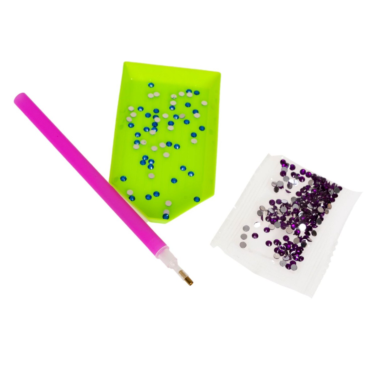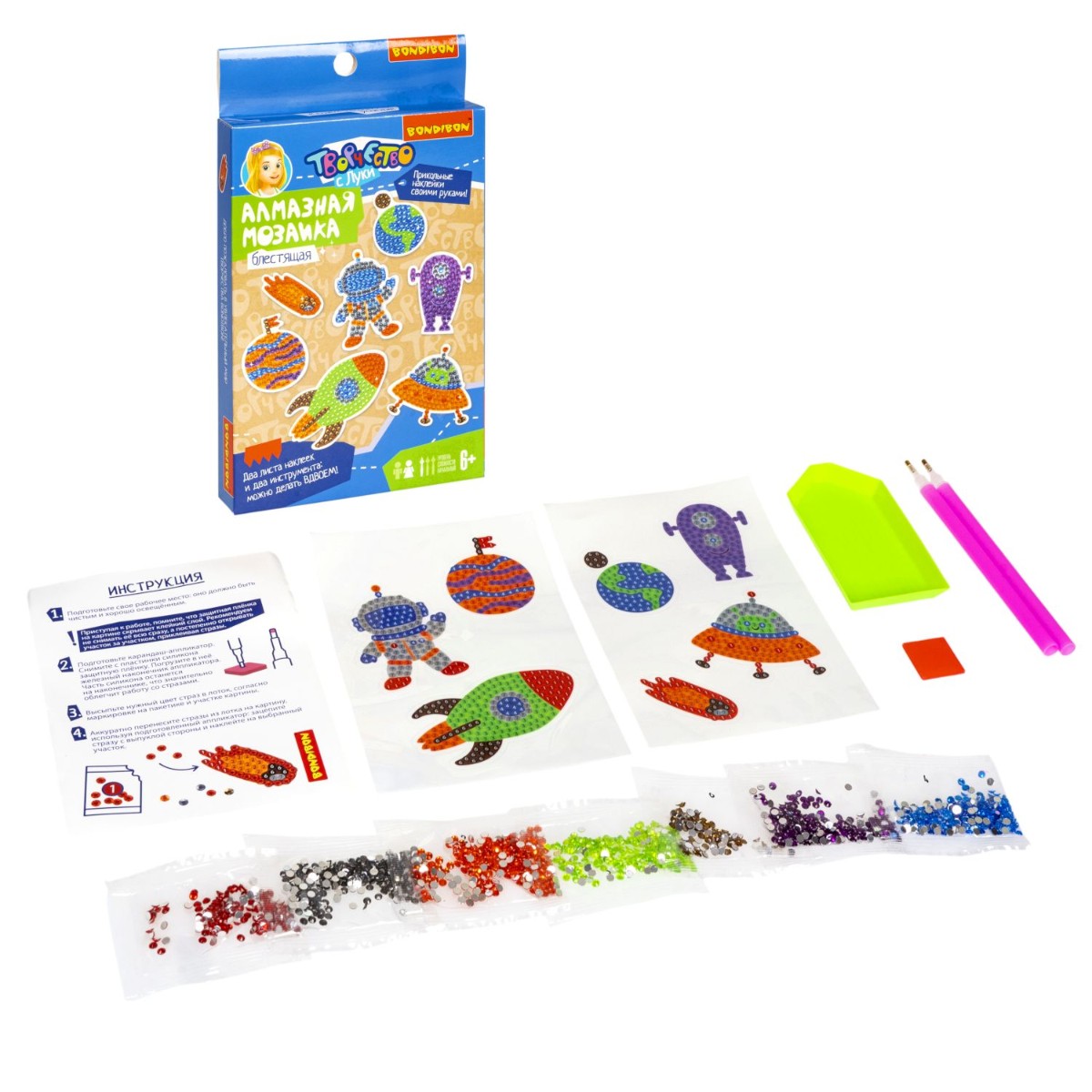 Творить можно вдвоем. В наборе для поделок 2 цветные основы с клейким слоем, стразы, лоточек и 2 карандаша-аппликатора.