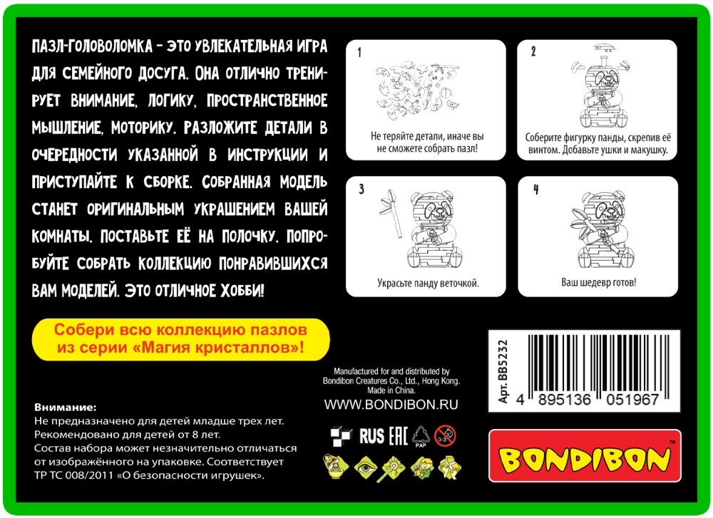 Пазл 3D "Панда" из серии Магия кристаллов Bondibon – это необычный набор с полупрозрачными деталями, с помощью которых можно создать фигуру в виде кристалла. Процесс сборки отлично развивает логику, пространственное мышление, внимание и мелкую моторику. Собирать можно как самостоятельно, так и всей семьей – так будет даже интереснее! Разложите детали в порядке, который указан в инструкции и начинайте скреплять их – Вам не понадобятся ни ножницы, ни клей. Рекомендуемый возраст 8+. Покупайте интеллектуальную головоломку пазл 3D "Панда" из серии Магия кристаллов Bondibon, украшайте свою комнату и соберите полную коллекцию понравившихся Вам кристаллов!