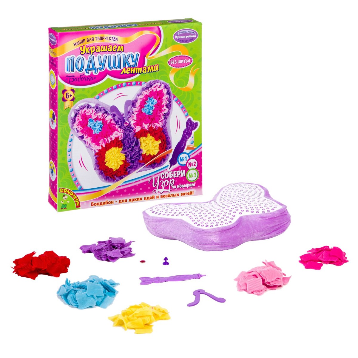 Набор для творчества Украшаем подушку лентами от ТМ BONDIBON позволит ребенку своими руками создать оригинальную подушку, которая станет ярким украшением комнаты. В комплект входит все необходимое. Способствует развитию мелкой моторики, фантазии, творческого начала и концентрации внимания. Состав набора: декоративная подушка, стилус, элементы украшений, лоскутки ткани (6 цветов)